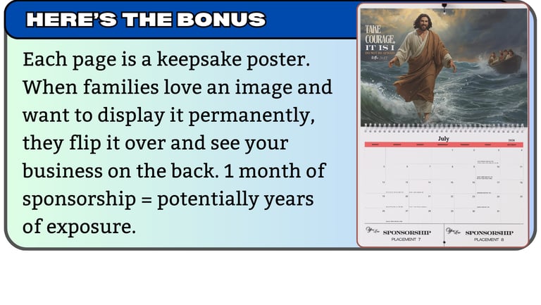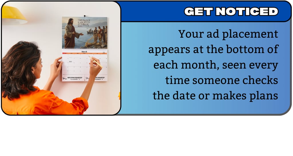 Our calendars are distributed to 500+ Christian households across Brisbane and the Gold Coast through local churches, Christian bookstores, and community groups. These are engaged families who value faith-based content and support local businesses.