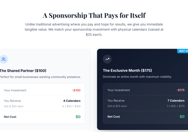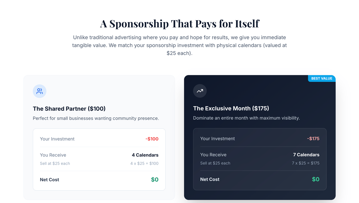Select either the $100 Starter/Silver 6”x2” shared placement + 4 calendars), or the $175 Premium/Gold (12”x2” exclusive placement + 7 calendars)