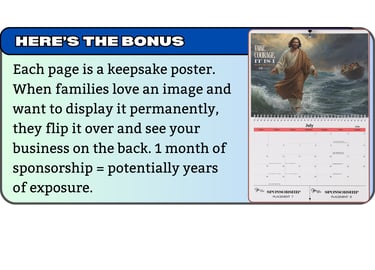Receive your calendars(valued at $25each). Sell them for $35 each and keep 100% of the profits while your ad reaches 500+ households.